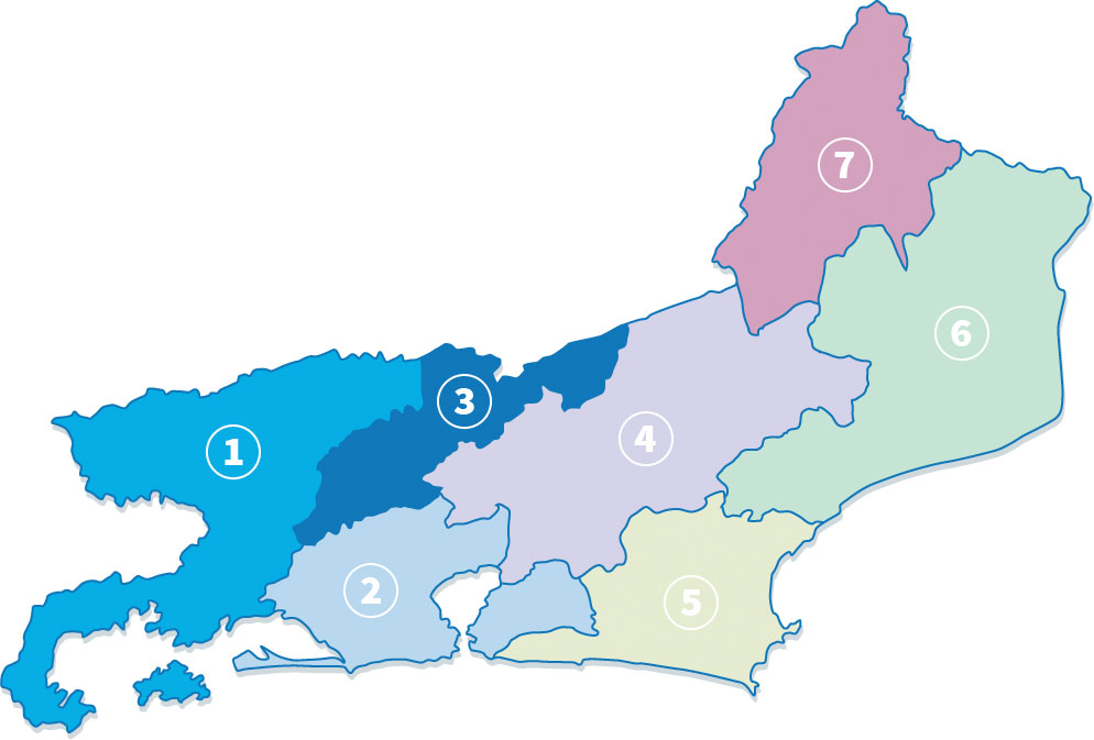 Belford Roxo, Duque de Caxias, Itaboraí, Itaguaí, Japeri, Magé, Mesquita, Nilópolis, Nova Iguaçu, Queimados, Rio de Janeiro, São Gonçalo e Niterói, São João de Meriti, Seropédica, Tanguá.
